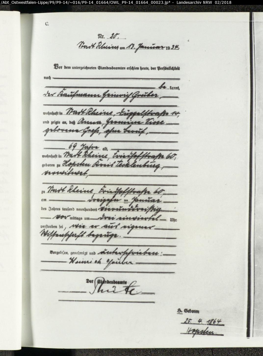 Rheine Stadt, Sterbenebenregister 1934, Nr.20 |