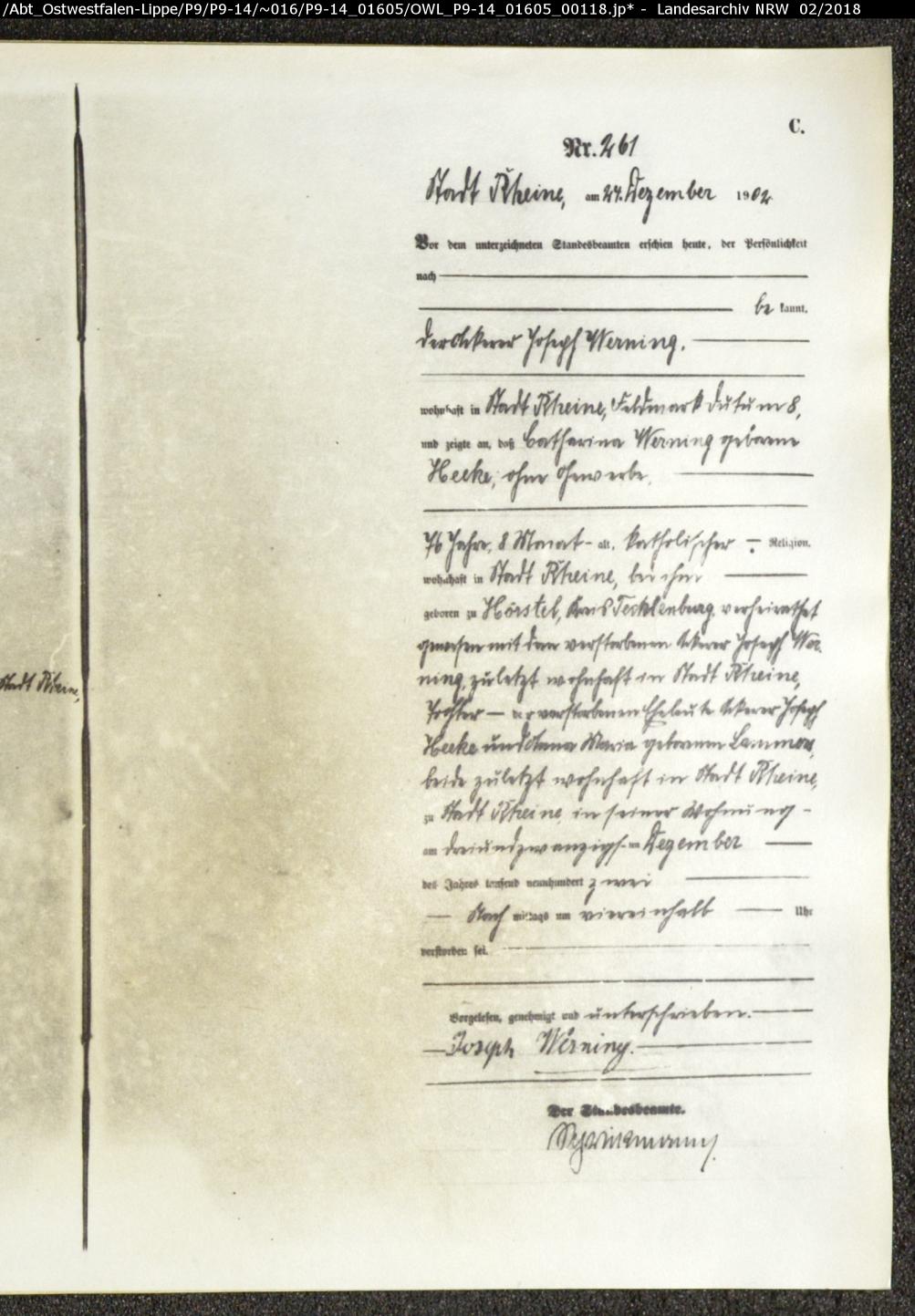 Bemerkungen: get. (rk) Paten: - Gerhard Werning, Grossvater - Catharina ? * am 12.9.1856 in Feldmark (Dutum) als Gerhard Joseph. Eltern sind der Koetter Gerhard Joseph Werning und Maria Catharina (Heeke). Geburtseintrag als Nachtrag auf Seite 30, teilweise kaum zu lesen. [*] Wohnort: 1902, Feldmark Dutum 8, Rheine [4] 1933, Auf dem Hörstkamp 8, Rheine Beruf: Landwirt [oo #6] |