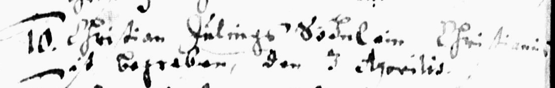 Religion: ev Taufpaten: "deßen Paten sind gewesen 1. Jürgen ... 2. Andreas Ziegler 2. Andreas Königsmarkcs Frau" Bemerkungen: "Christian Julingß Söhnlein Christianus ist bebohren den 10 Martij, gegen Abend zwischen 6 undt 7 Uhr, undt getauft den 14. ejusdem" [1] "Christian Julings Söhnlein Christianus ist begraben den 3 Aprilis" [2] |