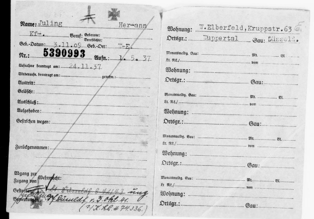 Bemerkungen: im II. WK gefallen [1] Ereignis: Mitgliedschaft: 01.05.1937: NSDAP, Ortsgruppe Wuppertal, Wuppertal-Elberfeld [2] |