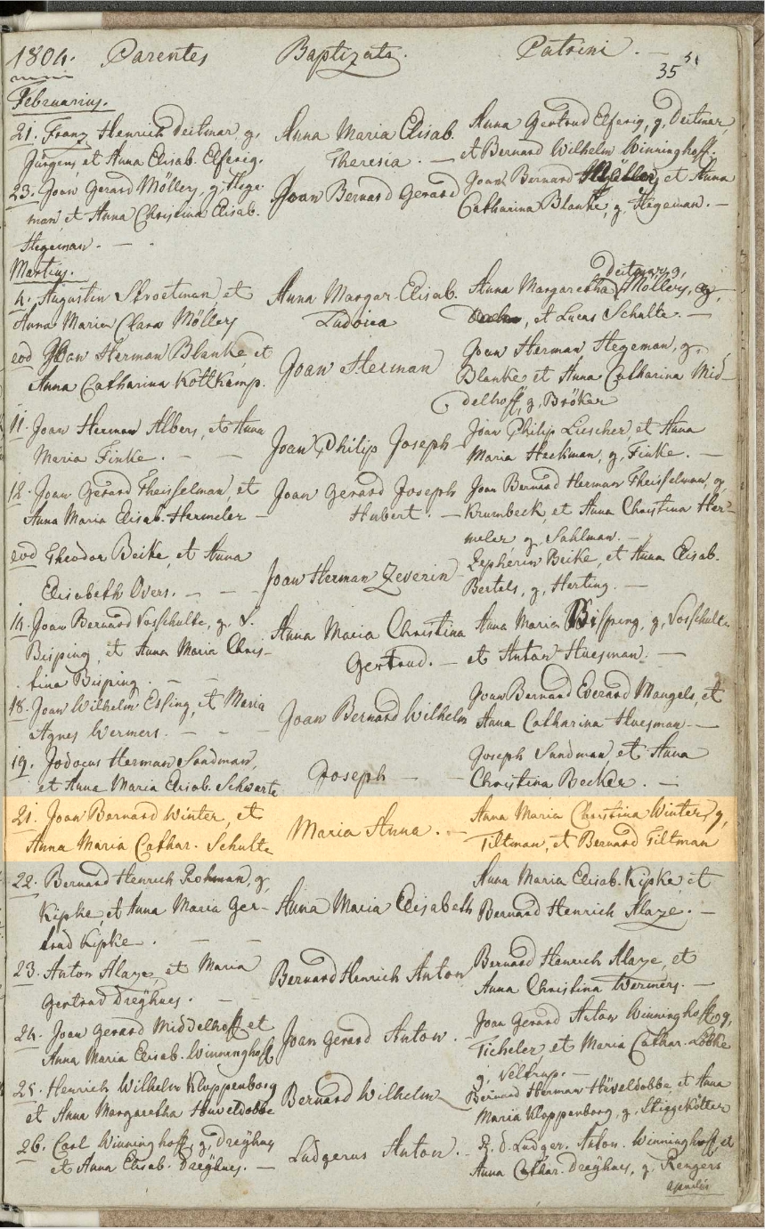 Religie: rk getauft in St. Pankratius, Emsdetten Peetvaders: - Anna Maria Christina Winter g. Tiltman - Bernard Tiltman |
