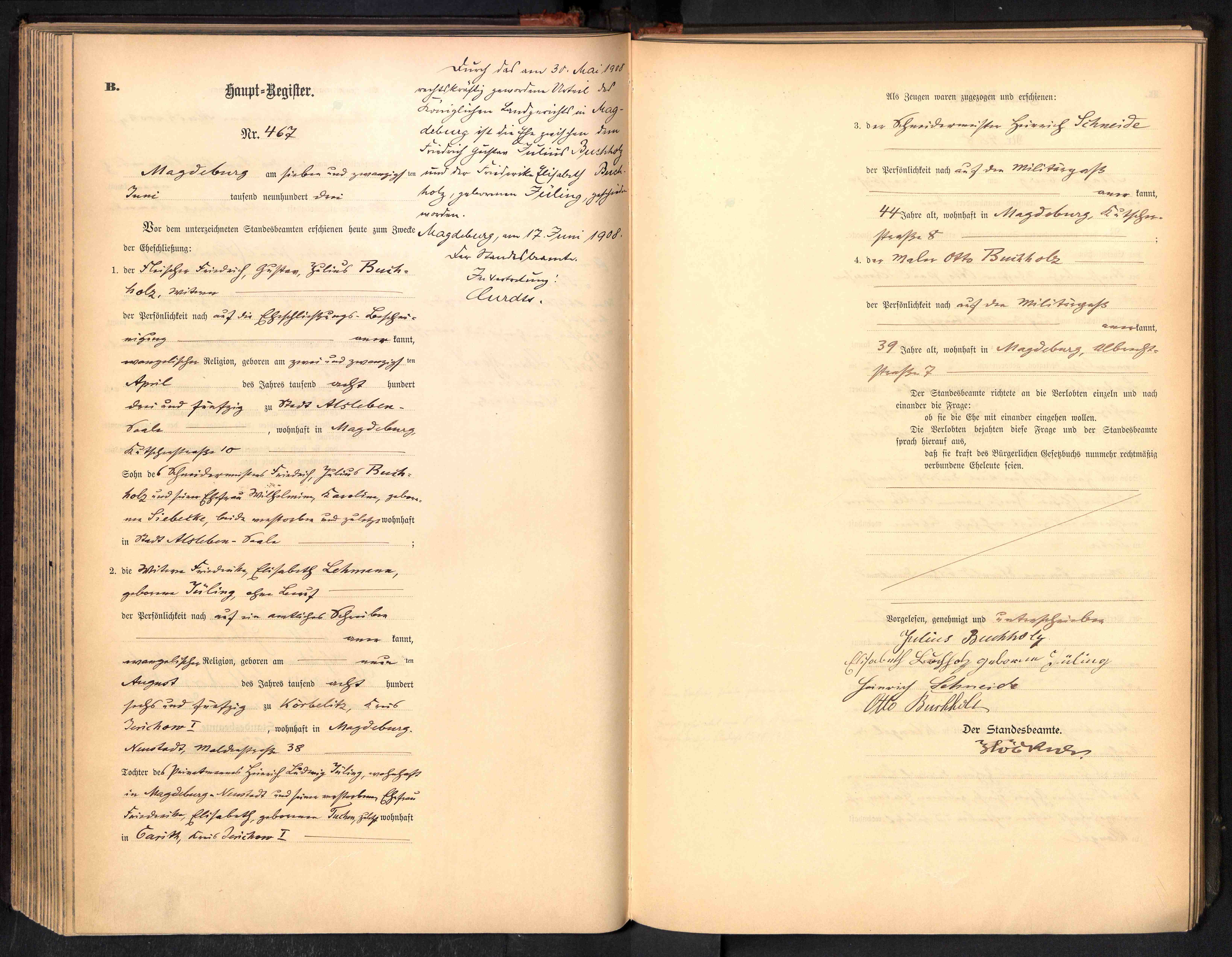 Evenement: Scheidung: 30.08.1908: Durch das am 30.Mai 1908 rechtskräftig gewordene Urteil der königlichen Landgerichtes in Magdeburg ist die Ehe zwischen dem Friedrich Gustav Julius Buchholz und der Friederike Elisabeth Buchholz, geb. Jüling, geschieden worden., Magdeburg |