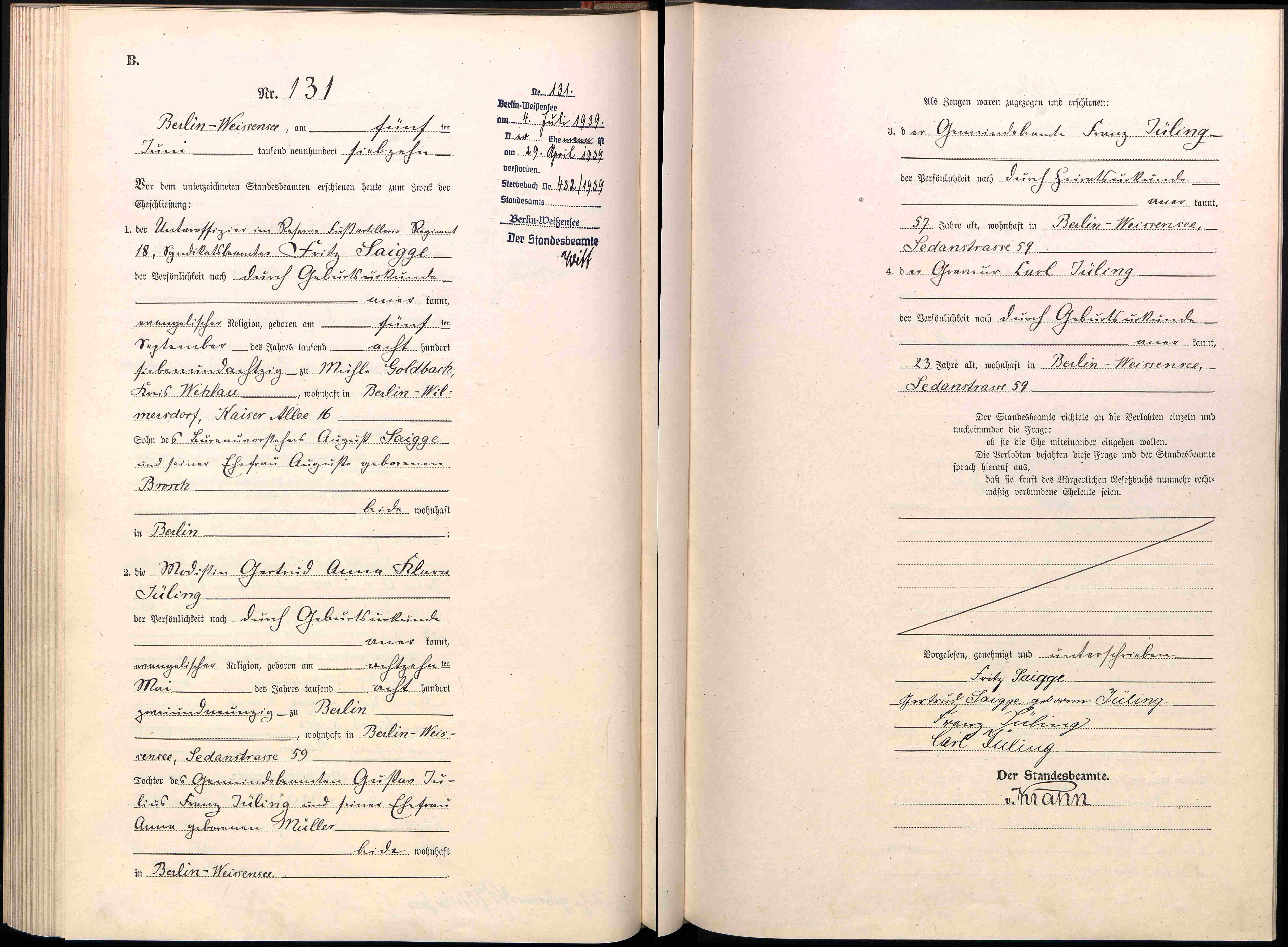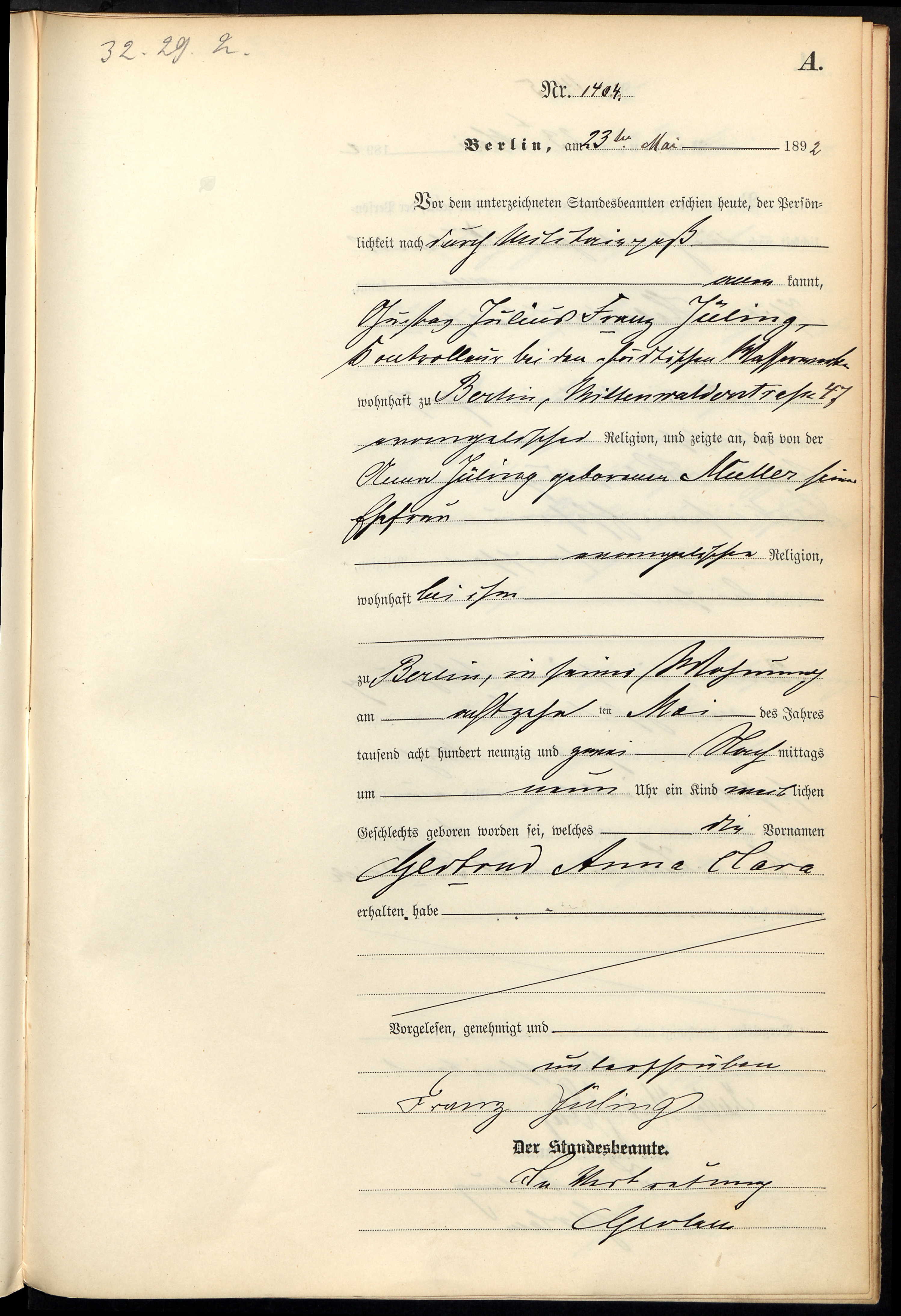 Religion: ev Wohnort: 1892, Mittenwalderstraße 47, Berlin [1] 1917, Sedanstrasse 59, Berlin-Weißensee [2] Beruf: 1917: Modistin, Berlin [2] |