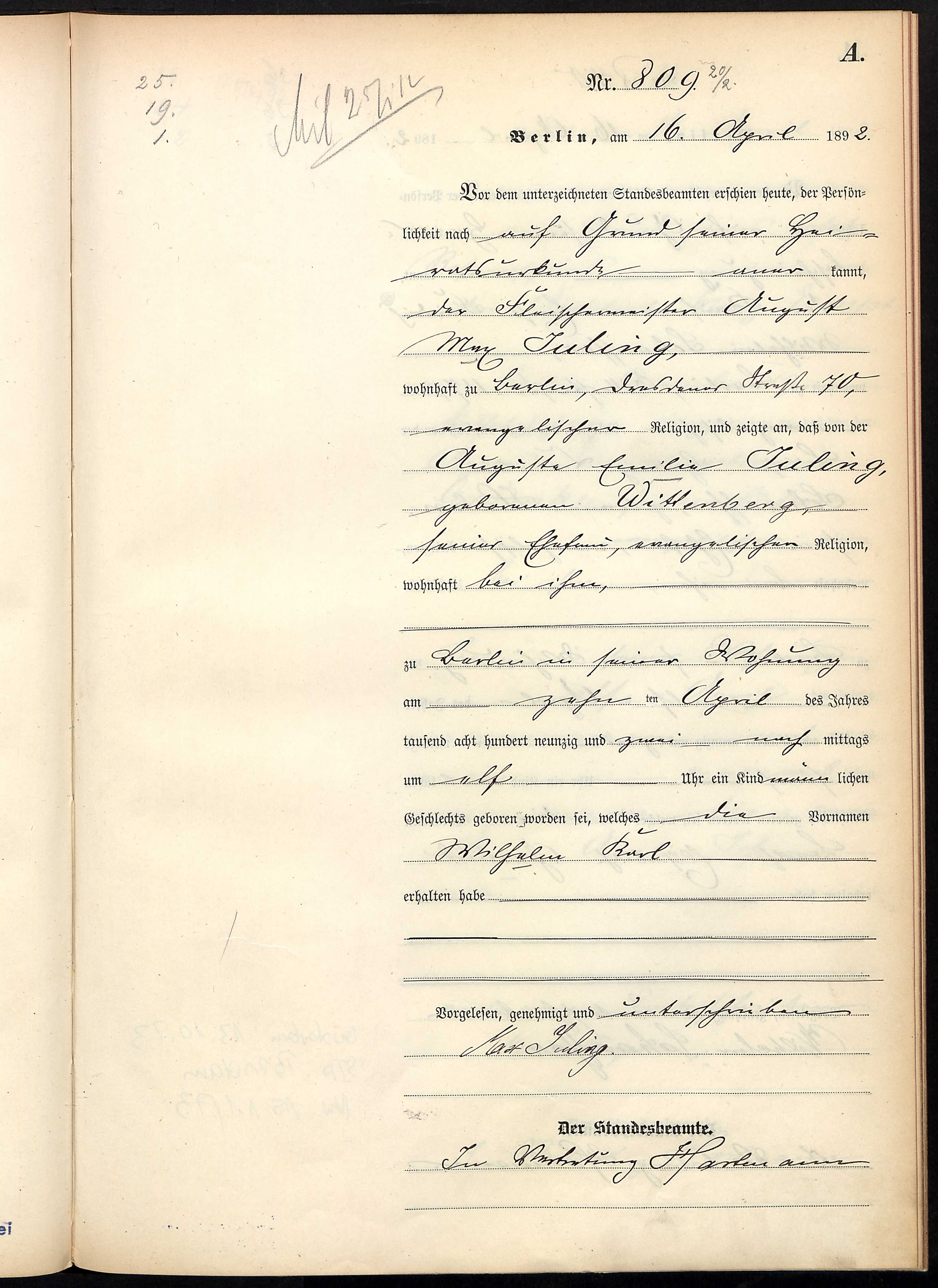 Religion: ev Taufpaten: Fr. Neumann Fr. Jehn Frl. Juling Wohnort: 1892, Dresdener Str. 70, Berlin-Kreuzberg [2] |