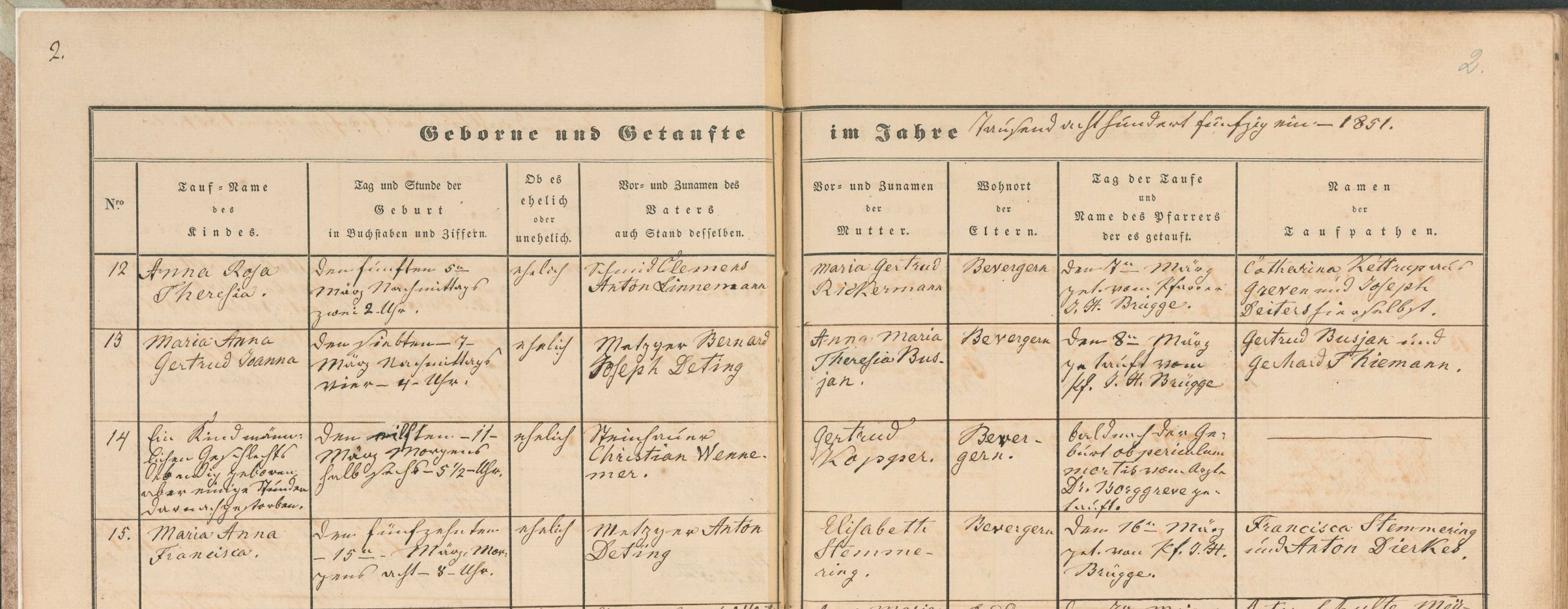 Religion: rk Taufpaten: Gertrud Busjan und Gerhard Thiemann Bemerkungen: 08.03.1851: getauft durch Pfr. Brügge, Bevergern [1] |