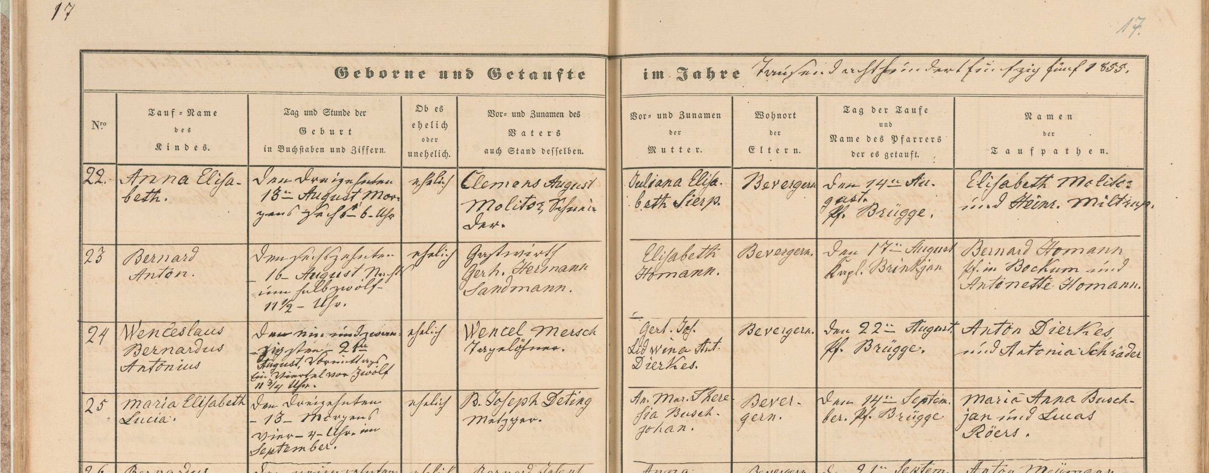 Religion: rk Taufpaten: Maria Anna Buschjan und Lucas Röers Bemerkungen: 14.09.1855: getauft durch Pfr. Brügge , Bevergern [1] |