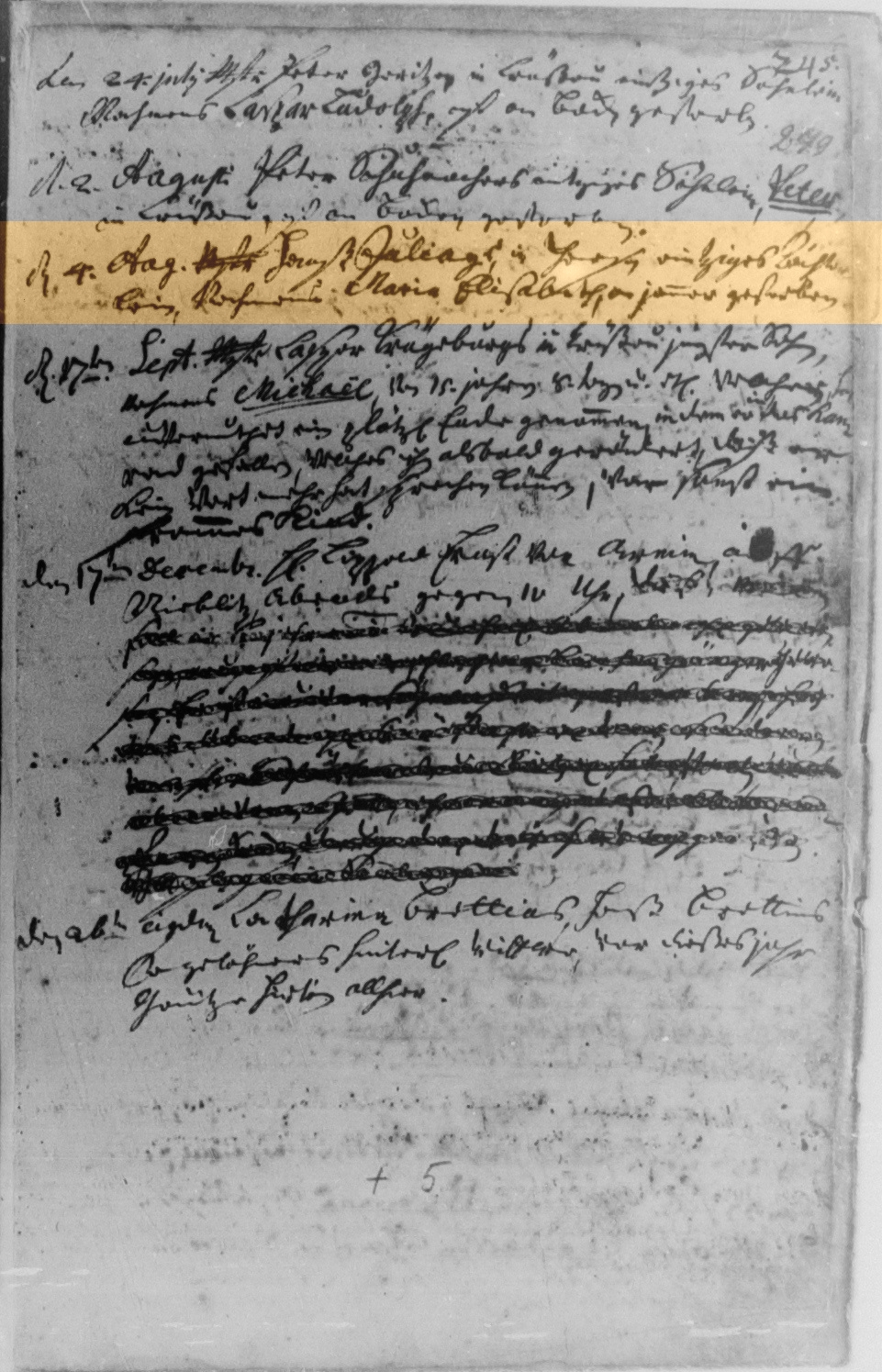 Religion: ev Bemerkungen: "Den 13. Juli Hannß Juling, Schmidt ..., von seier Frau Margretha ein Töchterlein welches den 16, die Heil. Tauffe erlanget u. Maria Elisabeth genannt worden. ... bald danach wiederum tot entschlafen." Die Mutter wurde im Taufeintrag "Margretha" genannt, obwohl die Frau von Johannes eigentlich "Dorothea" hieß. Möglicherweise war das eine erste Heirat; der Tod der Mutter ist aber in Theessen nicht verzeichnet. "Den 4. Aug. Mstr. Hanß Julings, in Theeßen einziges Töchterlein,... Maria Elisabeth, an jammer gestorben." [2] |