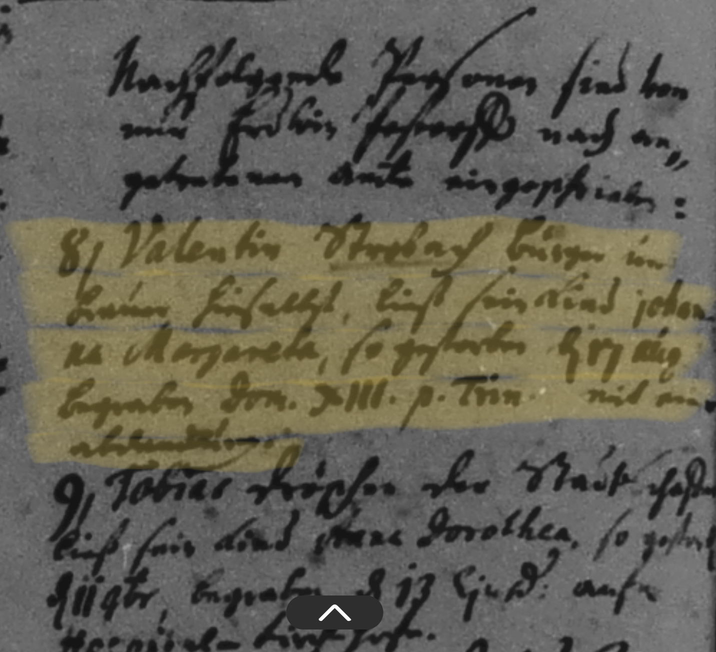Bemerkungen: „Valentin Strobach Bürger und Brauer hierselbst, ließ sein Kind Johanna Margareta, so gestorben d.17 Aug begraben Dom. XIII. p. Trin.mit einer abdanckung.“ [1] |