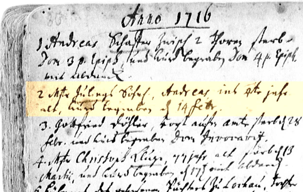 Religion: ev Taufpaten: - Mstr. Christian Steruber - Andreas Köppen - Valentin Strobachs jun. Frau Bemerkungen: "Mstr. Jürgens Juling et exor Barbara Dorothea Köppen ließen ihr Söhnl: geb. d. 6. May morgens um 8 Uhr, taufen d. 8ten Ejusd., hieß Andreas" [1] "Mstr. Julings Söhnl. Andreas ins 4te jahr alt, wurd begraben den 14. Febr." [2] |