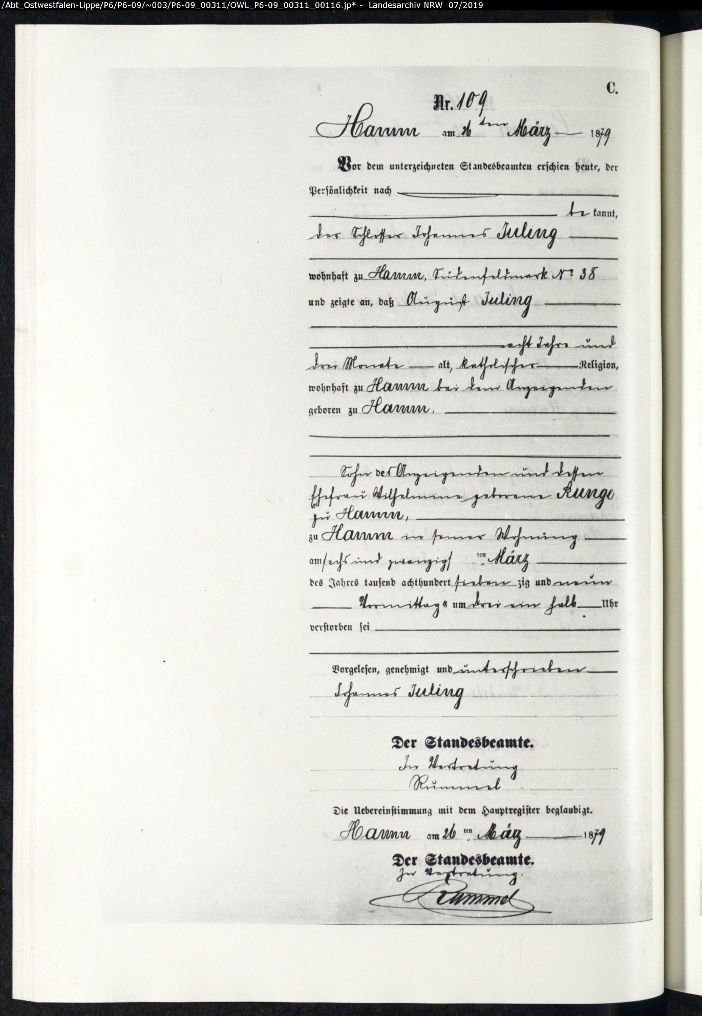 Deutschland, Geburten und Taufen, 1558-1898 Sterberegister Arnsberg, Detmolt, Münster, 1879, Nr.109, https://www.landesarchiv-nrw.de/data01/Abt_Ostwestfalen-Lippe/P6/P6-09/~003/P6-09_00311/OWL_P6-09_00311_00116.jpg? |