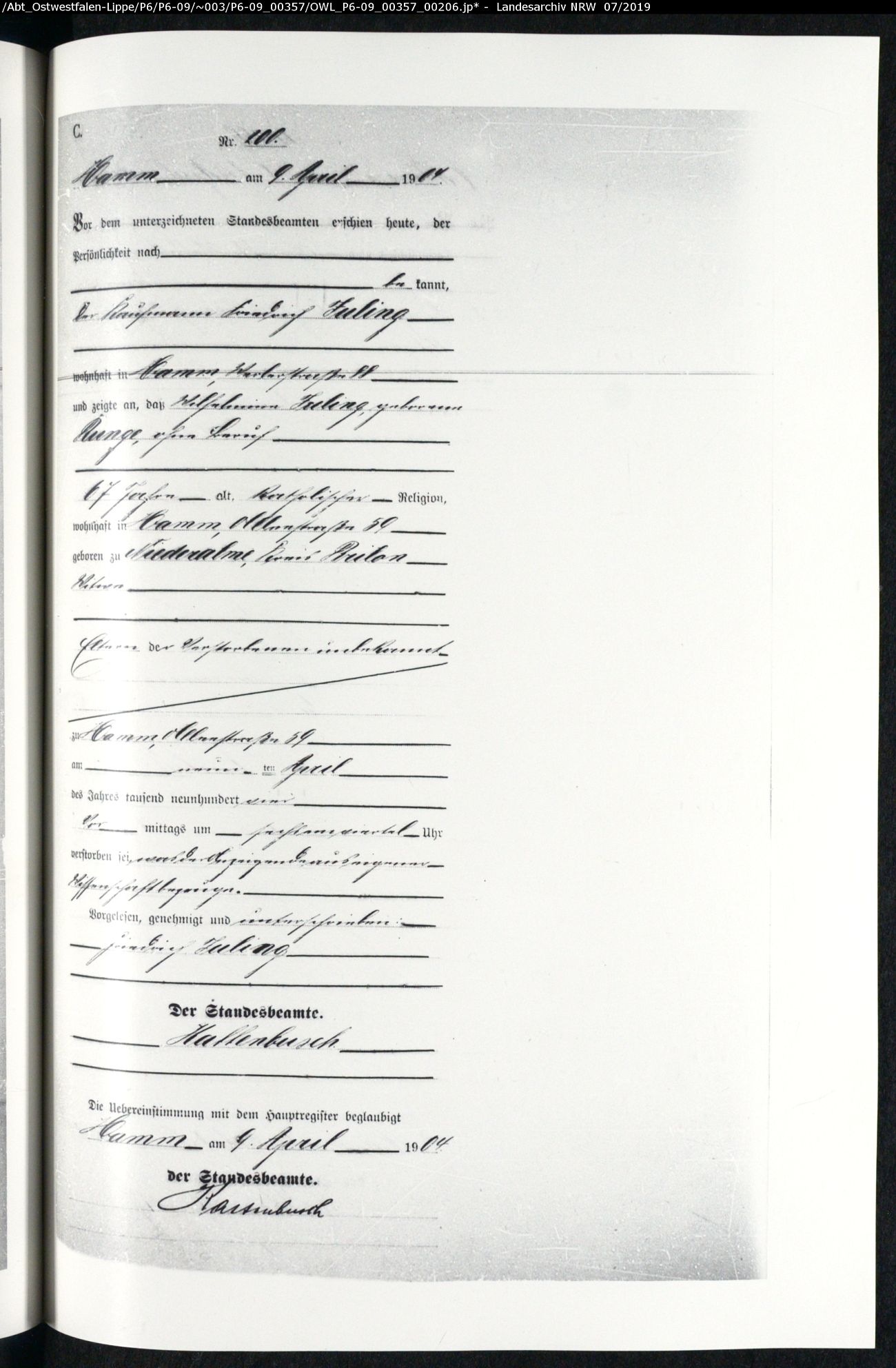 Deutschland, Geburten und Taufen, 1558-1898 Sterberegister Arnsberg, Detmolt, Münster, 1904, Nr.100, https://www.landesarchiv-nrw.de/data01/Abt_Ostwestfalen-Lippe/P6/P6-09/~003/P6-09_00357/OWL_P6-09_00357_00206.jpg? |