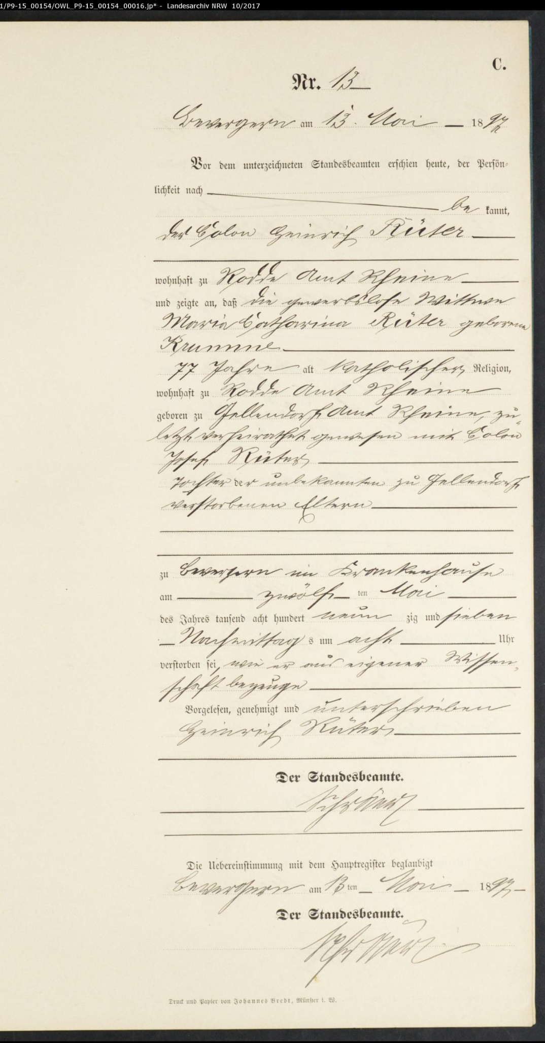 Religion: rk Bemerkungen: 12.05.1897: gestorben im Krankenhaus, Bevergern [2] Wohnort: , Rodde [2]