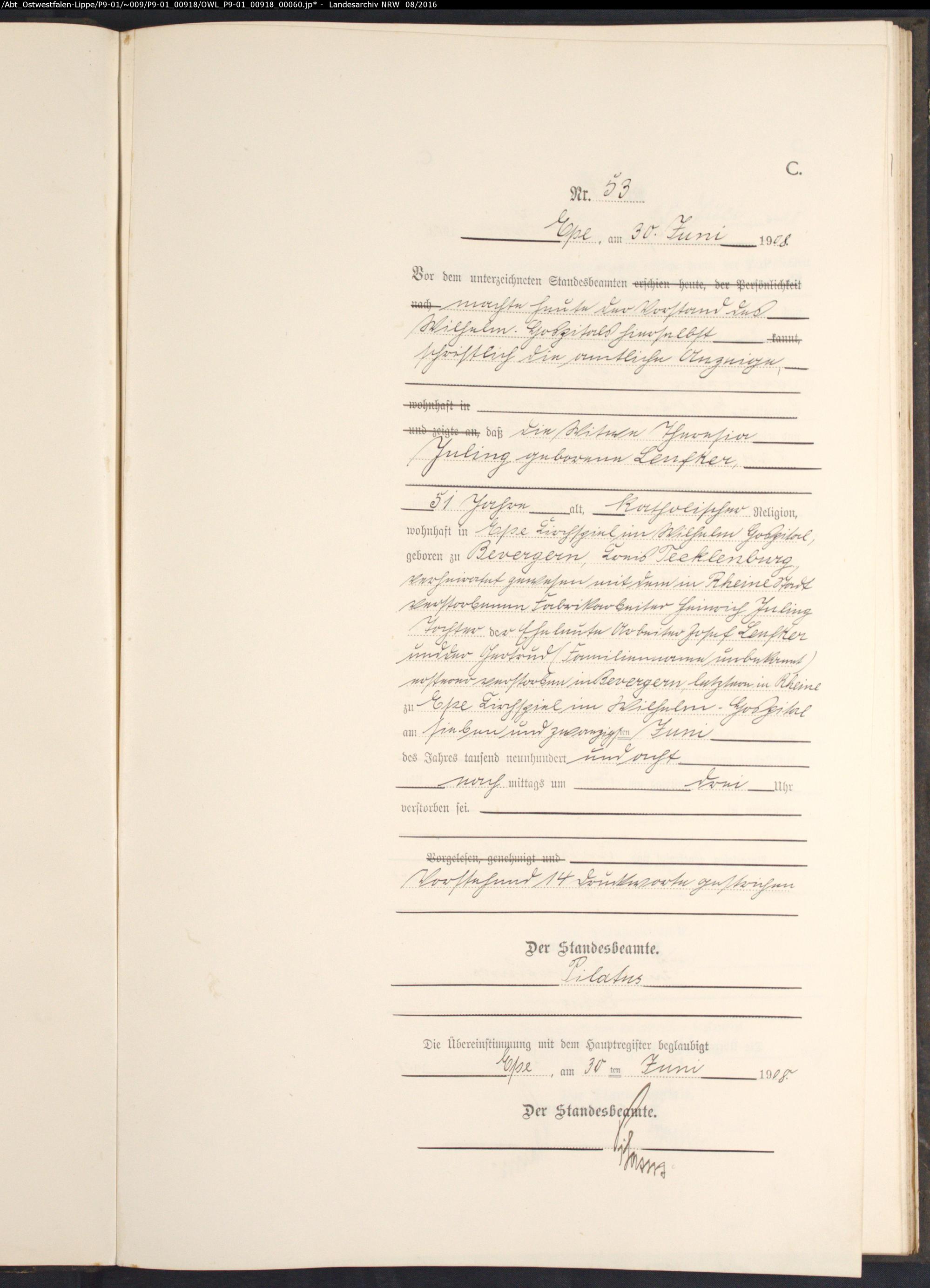 Standesamt Ahaus Sterberegister Epe, 1908, Nr.53, http://www.landesarchiv-nrw.de/data01/Abt_Ostwestfalen-Lippe/P9/P9-01/~009/P9-01_00918/OWL_P9-01_00918_00060.jpg? |