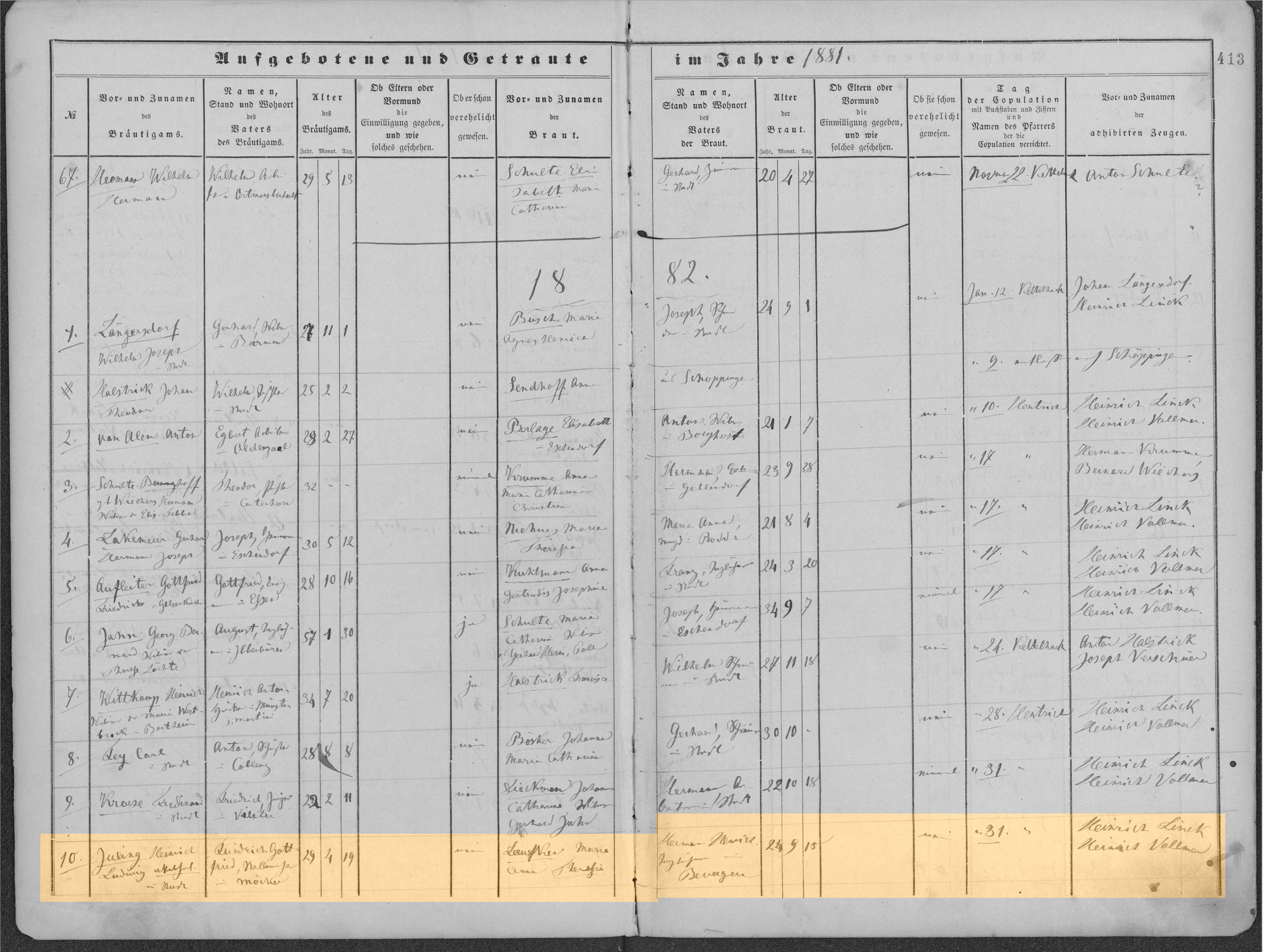 Kirchenbuch Rheine, St. Dionysius Heiraten 1882, Nr.10 |