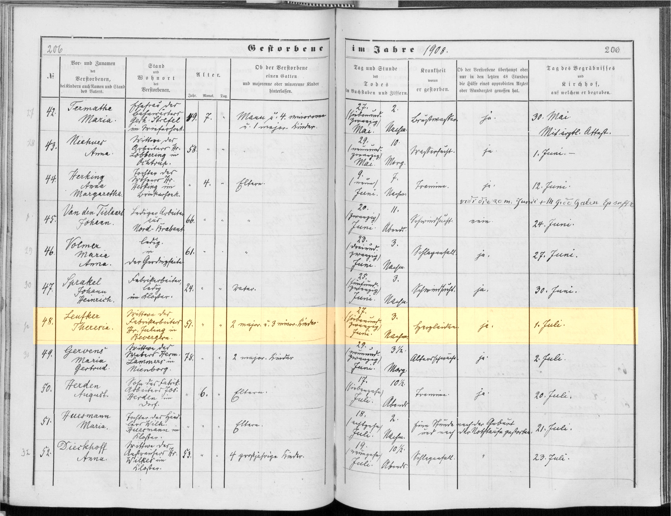 Kirchenbuch Epe, St. Agatha Gestorbene 1908, Nr.48 |