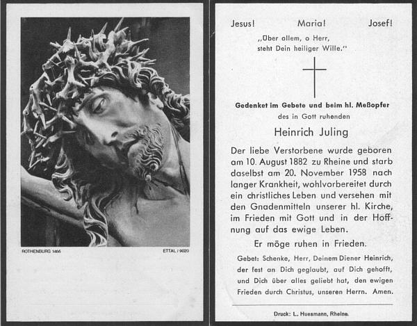 Religion: r.k. Taufpaten: Heinrich Schmitz Anna Greiwe Bemerkungen: Er war der Patenonkel von Josef Heinrich Juling (#2), hat ihn aber nicht als sein richtiges Patenkind anerkannt, weil der Täufling den Namen Heinrich als Zweitnamen bekam. Wohnort: 1924, Butterstraße 6, Rheine [3] Beruf: Fabrikarbeiter 1924: Tagelöhner, Rheine [3] |