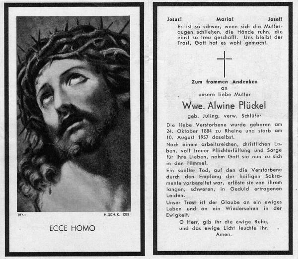 Religion: rk Taufpaten: Anton Schubert Alwine Musche Bemerkungen: Wegen des frühen Verlustes der Eltern übernahm sie vor allem für Aloysius Joseph (#4) eine Ersatzmutterrolle. Wohnort: 1903, Nr. 197, Eschendorf [3] Beruf: 1903: Fabrikarbeiterin [4] |