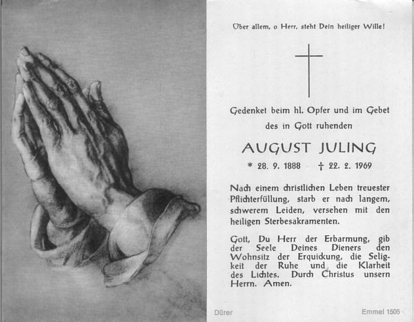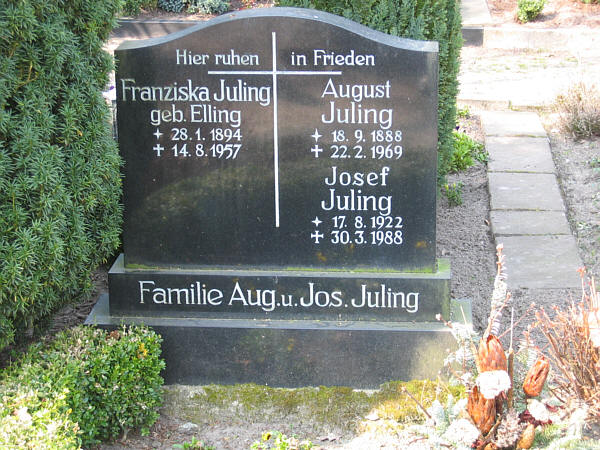 Religie: rk Peetvaders: Heinrich Leufker Anna Greiwe Opmerkingen: Gerichtsverhandlung: „Münster, 16. Januar. Drei junge Leute, ehemals Fürsorgezöglinge des Martinistifts zu Nottuln, standen heute unter der Anklage des gemeinschaftlich verübten Straßenraubes (Anm.: am 7.10.1907) vor dem Schwurgericht und zwar die Ackerknechte Gustav Hartmann, August Juling und Joseph Butz. Letzterer ist mit seinen 21 Jahren der älteste der drei Angeklagten. Eine gewisse Erklärung dafür, daß diese verhältnismäßig noch so jungen Menschen sich bereits in so schwerer Weise strafbar machen konnten, wird wohl zum Teil in ihrem bisherigen Lebensgange gefunden werden können. [...] Juling ist am 18. September 1888 zu Eschendorf bei Rheine geboren und im Gegensatz zu Hartmann bisher mit dem Strafgesetz noch nicht in Konflikt gekommen. Er kam in Fürsorge-Erziehung, weil seine Mutter nach dem Tode des Vaters den Knaben in jeder Hinsicht vernachlässigte und dem Trunke ergeben war. Seit 1903 Zögling im Martinistift, trat er 1904 als Knecht in die Dienste des Kötters Alfers in Senden und zwei Jahre später in die des Kolons Bernhard Finkenbrink in Bösensell, die beide im großen und ganzen mit seiner Führung nicht unzufrieden waren. [...] Das Urteil lautete gegen Hartmann und Butz, unter Berücksichtigung ihrer wiederholten Vorstrafen, auf je 2 Jahre, gegen Juling auf 1 Jahr Gefängniß.“, Schwurgericht, Münster [3] 16.01.1908: Weiterer Bericht von der Gerichtsverhandlung:, Schwurgericht, Münster [4] Beroep: Eisenbahner |