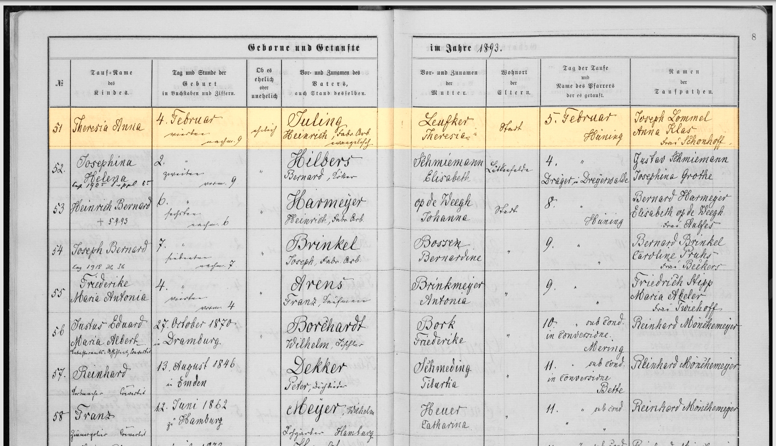 Religion: r.k. Taufpaten: Joseph Lommel Anna Klas, Fraus Schonhoff Bemerkungen: am 4.2.1974 im Krematorium Usselo (NL) verbrannt. Sie hat schon mit 17 Jahren wohl unter Protest der Familie den Holländer van Zuylekom geheiratet und ist nach Enschede gezogen, wo sie auch starb. Zwischen ihren Kindern und Joseph Heinrich Juling (#2) hat stets eine freundschaftliche Beziehung bestanden. |