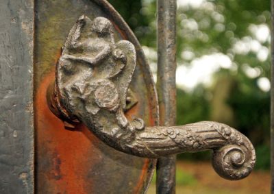 Die nur bei genauer Betrachtung als solche zu erkennende Engelsfigur ist eine von insgesamt sechs gleichartigen Figuren, die die Klinken der Pforten des Hauptzugangs zum neuen Lesumer Friedhof schmücken. Die Tore – darauf deuten die auf ihnen thronenden vergoldeten Initialen „LK“ hin, stehen in engem Zusammenhang mit Baron Knoop und dem 1933 abgebrochenen Schloss Mühlenthal in St. Magnus: Ludwig Knoop soll die Tore, die den Eingangstoren zum parkähnlichen Garten seines eigenen Schlosses stark ähnelten, zur Einweihung des Friedhofs im Jahr 1882 gestiftet haben.