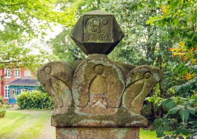 Das Foto zeigt eine der beiden Torabgrenzungen an der Einfahrt zum Haus Marßel in der Straße Marßel in Burgdamm. Eine Torsäule zeigt die Buchstaben MP und die Jahreszahl 1866, die andere CP 1866. Dort wohnte Johann Christoph Pellens mit seiner Frau Krönke Maria, geb. Pundt, die er 1843 heiratete. Aus dieser Ehe ging Johannes Pellens (1853 - 1930) hervor, der seiner Frau Alma oberhalb seines Elternhauses 1893 die „Villa Marßel“ bauen ließ.