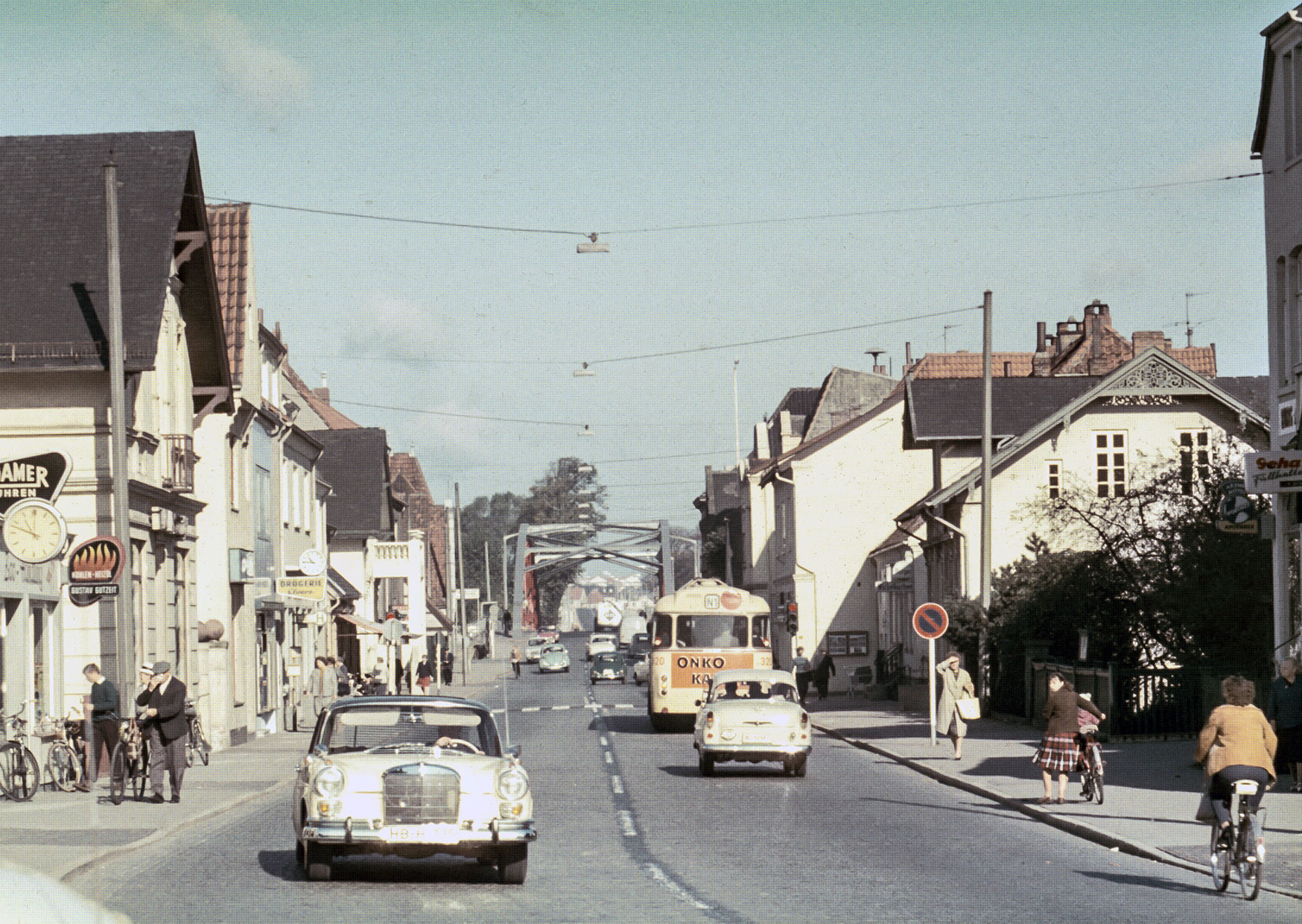 Links steht das ehemalige Wohnhaus von Lamcken mit der nach dem Krieg im Garten errichteten Baracke. Rechts gegenüber ist die Burg-Apotheke zu erkennen. Im Hintergrund sieht man die Burger Brücke. Viele der Gebäude sind mit kleinen Veränderungen noch heute vorhanden.