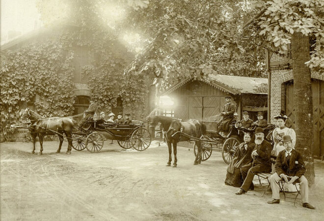 August 2023: Baron Ludwig Knoop, Stallungen Schloss Mühlenthal, St. Magnus; Foto: um 1890 Das Schloss Mühlenthal wurde vom Bremer Textilkaufmann und -unternehmer Baron Ludwig Knoop (1821-1894) in St. Magnus errichtet. Knoop hatte ein europäisches Textilimperium mit weitreichenden Handelsbeziehungen und Produktionsstätten vor allem in Russland aufgebaut. Lebensmittelpunkt von Knoop blieb im Alter aber Schloss Mühlenthal.