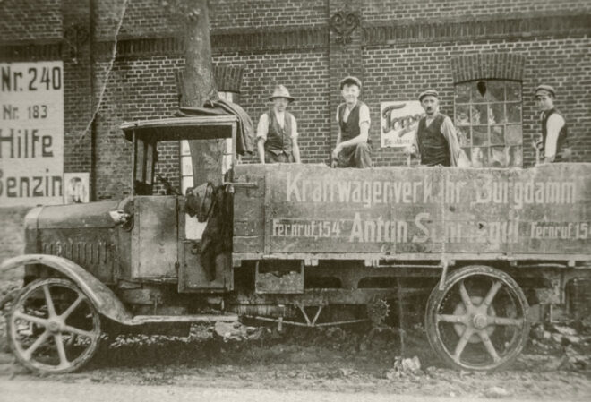 September 2023: Fuhrunternehmer Anton Schriegel, Stader Landstraße 35; Foto: nach 1925 Das Foto zeigt den Geschäftswagen der Firma Anton Schriegel mit seiner Belegschaft. Anton Schriegel´s Sohn Johann erlernte, wie sein Vater, das Schmiedehandwerk. Als sein Vater Anton nach dem 1. Weltkrieg zurückkam, reichte vermutlich die Arbeit nicht für zwei Meister. Daraufhin kaufte Johann einen LKW und gründete 1925 ein Fuhrgeschäft. Anfangs war der LKW noch mit Vollgummibereifung ausgestattet und der Antrieb erfolgte durch eine freiliegende Kette als Übertragung vom Motor auf die Achse. Die Enkel von Johann übernahmen später das Fuhrunternehmen. Dieses Haus steht noch heute fast unverändert an dieser Stelle.