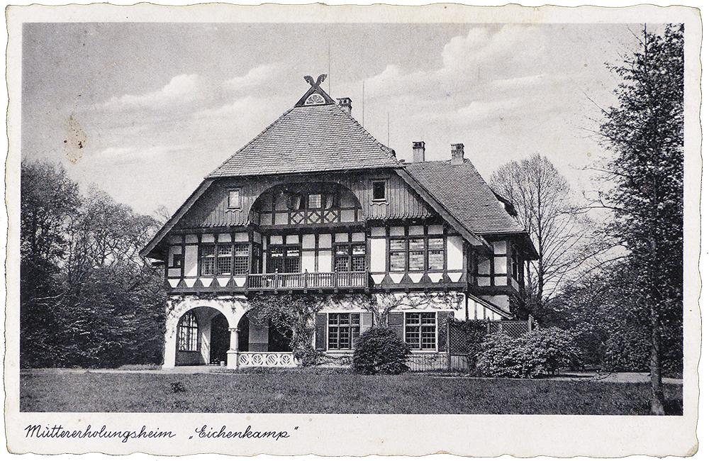 April 2024: Eichenkamp „Kränholm“; St. Magnus; Ansichtskarte vor 1937; Foto: E. Maack, Vegesack Baron Ludwig Knoop betrieb eine Baumwollspinnerei auf der estnischen Flussinsel „Kreenholm“, nach der er das Haus „Kränholm“ benannte. Es wurde für Wilhelm Kulenkampff und seine Frau Emilie, jüngste Tochter von Baron Knoop, 1896/97 in<br>Fachwerkbauweise nördlich der Bahntrasse Vegesack-Bremen errichtet. In der NS-Zeit wurde das Haus als Müttergenesungsheim „Eichenkamp“ genutzt. Nach 1945 diente es als Lungenheilstätte, die im Zusammenhang mit Haus Schotteck betrieben wurde. 1971 erfolgte der Abriss der Villa wegen des Ausbaus der B 74 (jetzige A 270). Die oberen Etagen wurden an der Ecke Am Hohen Ufer / Raschenkampsweg als Haus „Kränholm“ in Knoops Park wieder aufgebaut. (Archiv HVL AK00057)