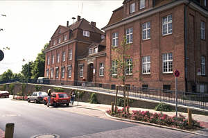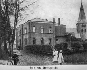 vor dem neuerlichen Umbau Das Königliche Preußische Amtsgericht mit der damaligen Numerierung 52 (heute als Polizeihaus die Nr.32) war ein nüchterner Rotsteinbau mit halbrunden Fenstern und mit einem flachen Zeltdach versehen. Vier Gefängniszellen hatte man dem Gebäude angefügt. Ganze vier Jahrzehnte hatte hier der erste Amtsrichter ADICKES (1854-1894) gewirkt, dessen Sohn Franz (1866-1915) Bürgermeister von Frankfurt am Main wurde. 1895 folgte Amtsgerichtsrat BERNHARD.